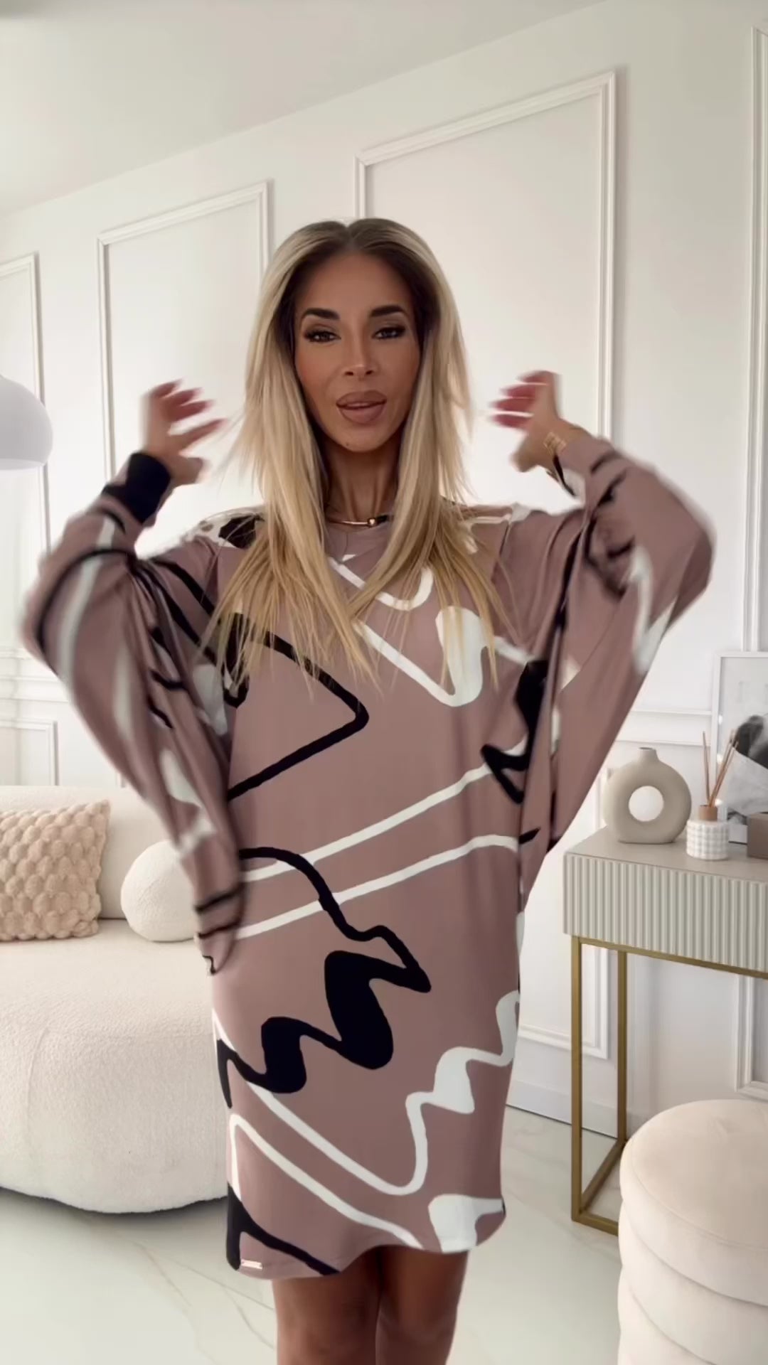 Bleiben Sie warm und stilvoll mit dem Batwing Sweater Dress von Numoco, einer perfekten Kombination aus Komfort und Eleganz für kalte Tage. Dieses Kleid aus dehnbarem Strickstoff mit einzigartigem beigem Grund und kräftigem schwarz-weißem Muster verleiht Ihrer Garderobe eine raffinierte Note.
