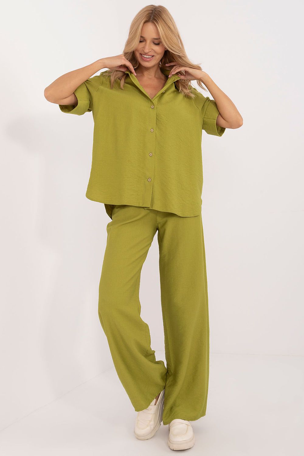 Lakerta Leinen-Sommerset, bestehend aus einem 3/4-Ärmelhemd undeiner weit geschnittenenHose mit hohem Bund.Natürliche Eleganz trifft auf leichten Tragekomfort für warme Tage. Dieses luftige Zweiteiler-Set aus 100 % Leinen besteht aus einem locker sitzenden Hemd mit 3/4-Ärmeln, klassischem Kragen und Knopfleiste – perfekt für einen entspannten und gleichzeitig eleganten Look. Ein Bindegürtel in der Taille ermöglicht die individuelle Anpassung der Passform und betont die Silhouette dezent. Die hochgeschnittene, weite Hose bietet maximale Bewegungsfreiheit und ein zeitlos lässiges Tragegefühl. Praktische Seitentaschen machen das Set funktional und stylisch – ideal für Alltag, Reisen oder entspannte Sommertage.