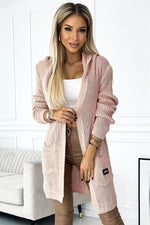 Cardigan, et varmt sengeteppe med hette, lommer og lapp. Laget av tykkere genserstoff i beige farge. Merke numoco. Europeisk produksjon.